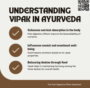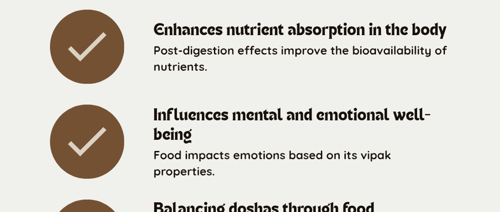 3. Vipaka (Final Post-Digestive Effect): This is the final outcome or the long-term effect the substance has on your tissues, mind, and bodily functions once it has been completely metabolized.